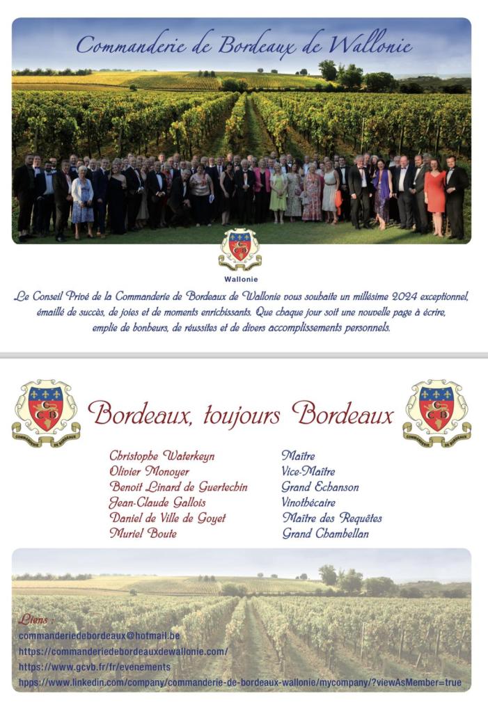 de Wallonie vendredi 5 avril 2024 : une dégustation de superbes bouteilles orphelines rive droite/rive gauche et de Crémants de Bordeaux de la cave de la Commanderie dans un des hauts lieux de l’excellence du négoce du vin en Brabant wallon-Est chez le tout nouveau gardien de la cave et Commandeur de Bordeaux de Wallonie : Claudio Pirquet.